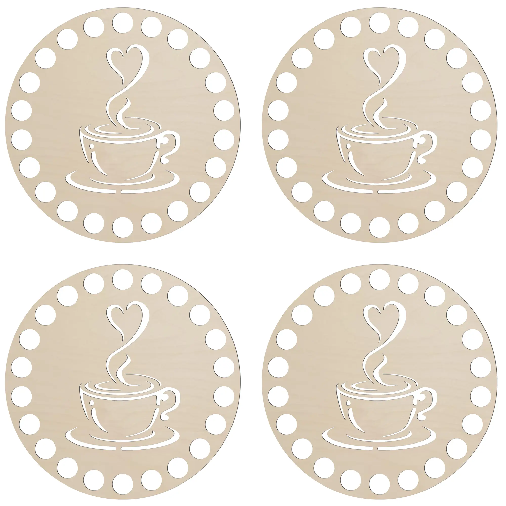 Gotowy zestaw 4 drewnianych baz pod kubek o średnicy 10 cm — idealne do szydełkowania, makramy i dekoracji DIY. Precyzyjnie wycięte laserowo, obustronnie wyszlifowane i wyposażone w otworki ułatwiające wyplatanie lub przytwierdzanie ozdób. Naturalna sklejka sprawia, że podkładki są trwałe, lekkie i gotowe do dalszej obróbki: malowania, lakierowania czy ozdabiania.