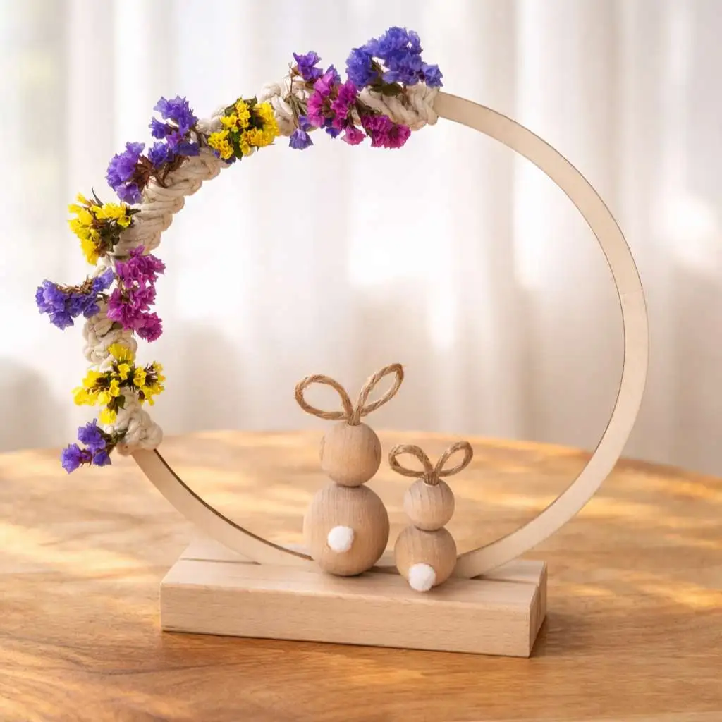 Drewniany stojak DIY może być wykorzystany między innymi do makram, tabliczek, dekoracji okolicznościowych, baz ze sklejki czy obręczy z kompozycjami florystycznymi. To praktyczny dodatek dla osób zajmujących się rękodziełem, pracowni handmade oraz wszystkich miłośników kreatywnych projektów.
