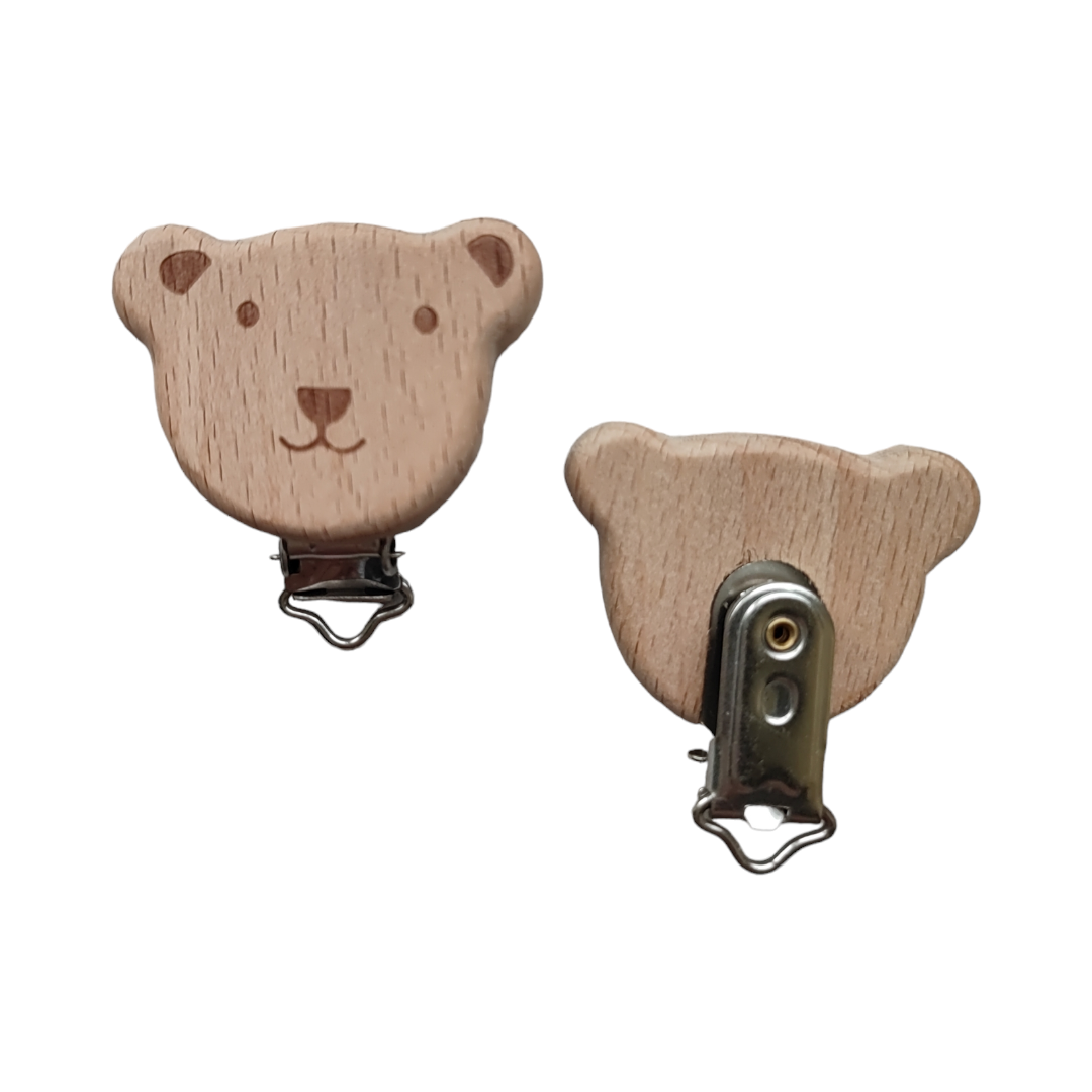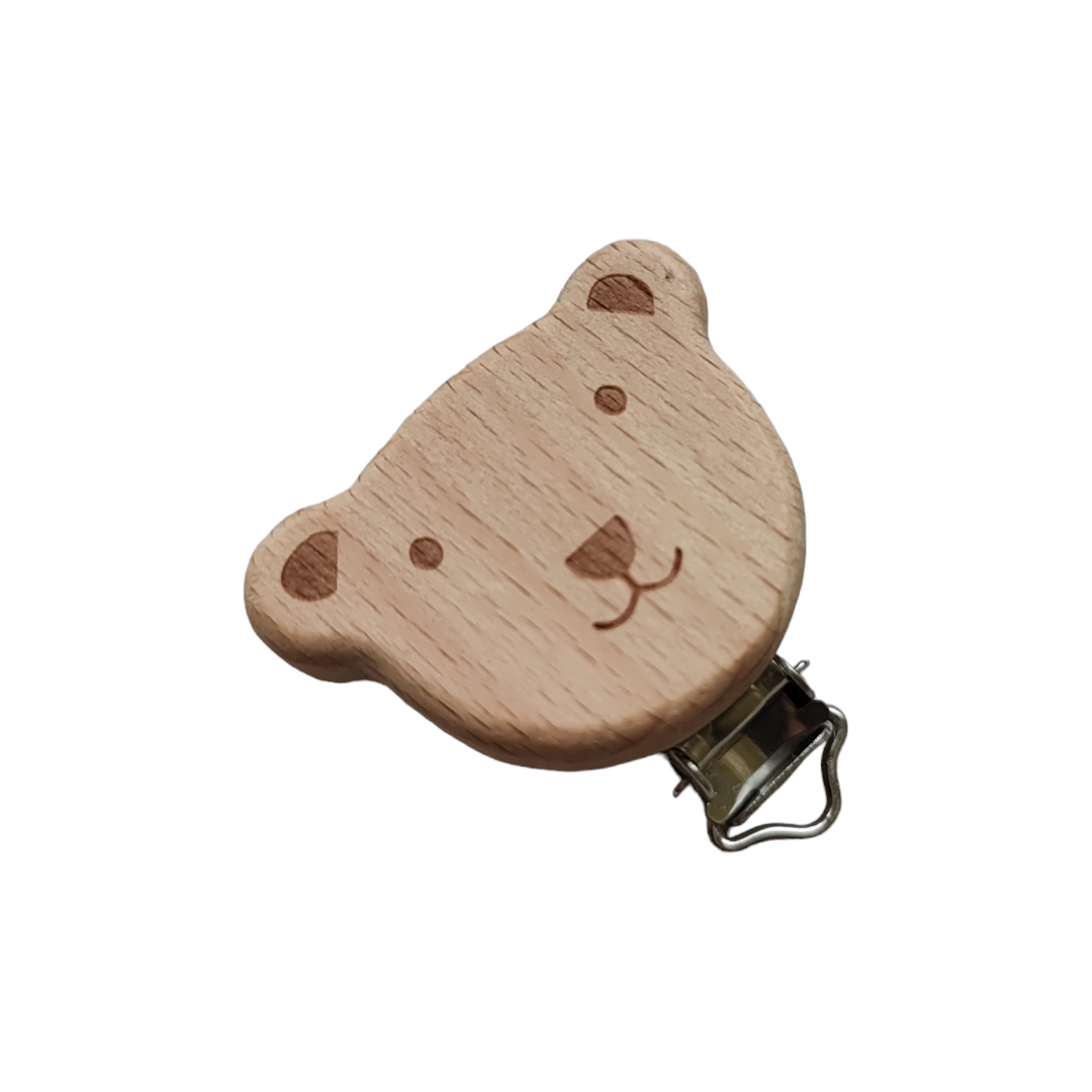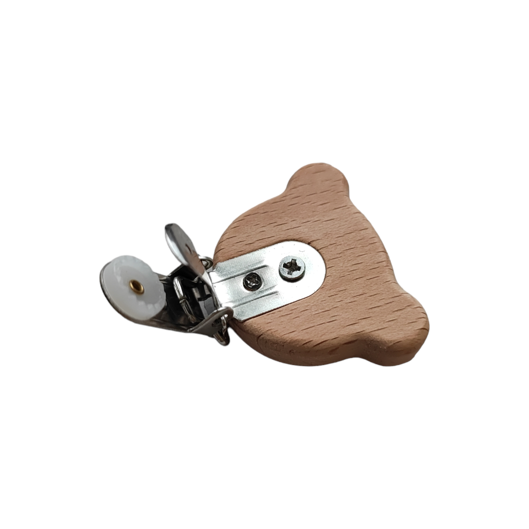Klips sprawdzi się idealnie, do samodzielnego stworzenia łańcuszka do smoczka lub gryzaka techniką makramy. Klips jest metalowy, z drewnianym misiem. Powierzchnia drewna jest wypolerowana i gładka.