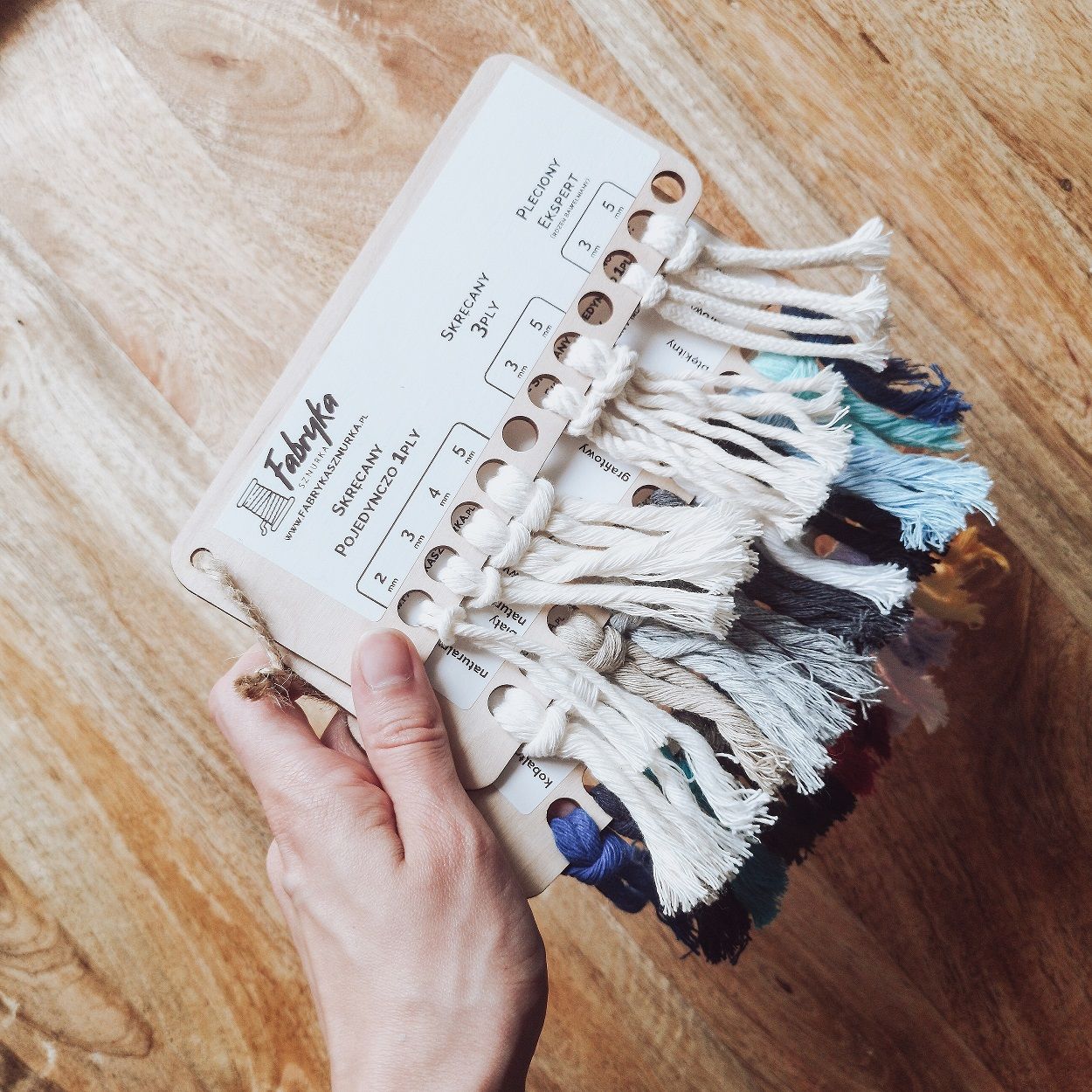 Próbnik umożliwia obejrzenie na żywo całej dostępnej gamy kolorów dla naszych sznurków skręcanych pojedynczo (1-PLY) oraz potrójnie (3-PLY). Jest wygodny w przechowywaniu. Dostępny w języku polskim.