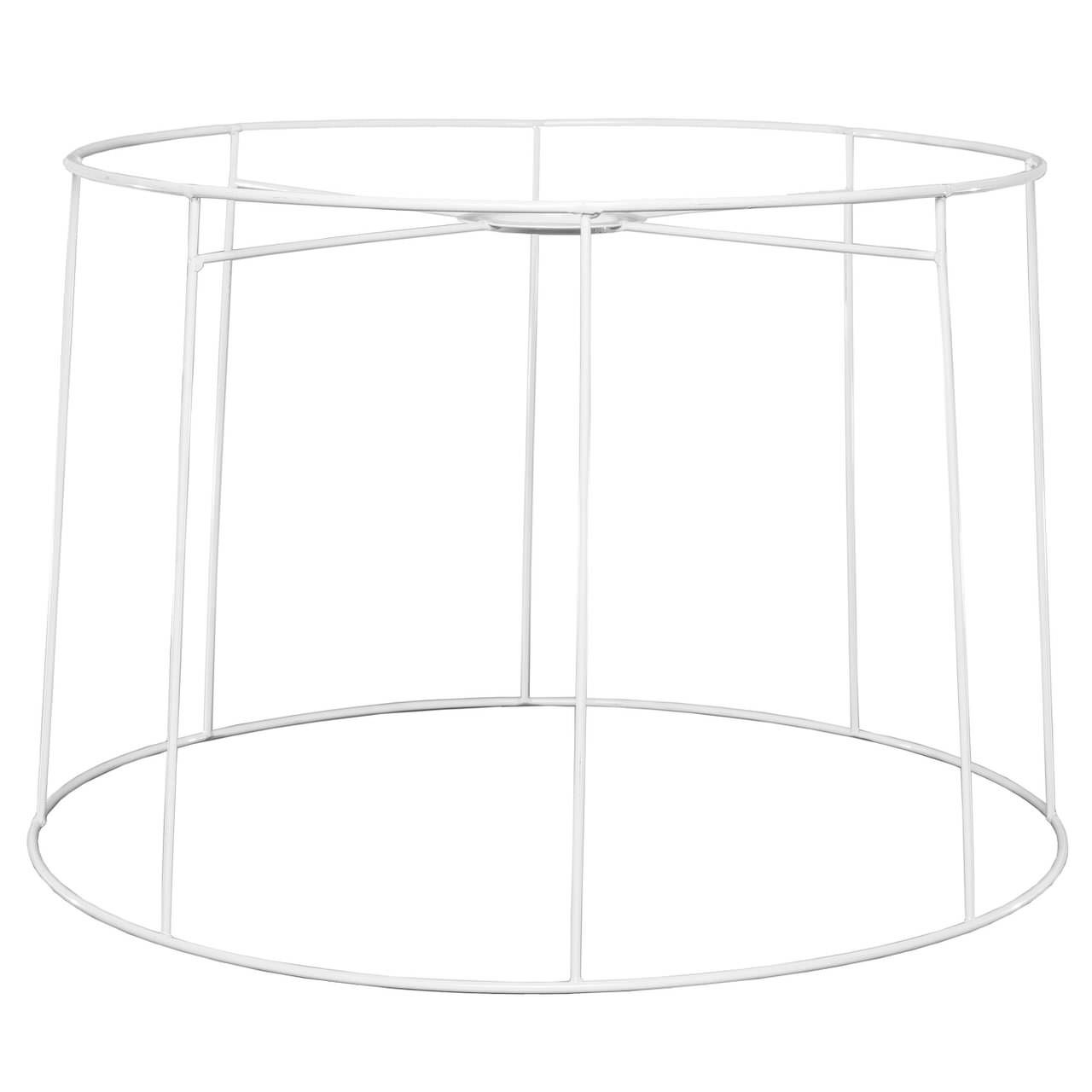 Metalowy stelaż w kolorze białym, lakierowany proszkowo. Jest to klosz do średniej wielkości lamp gabinetowych, podłogowych jak i wiszących w kształcie zbliżonym do klasycznego walca. Niezbędny do wykonania lampy/abażuru techniką makramy.